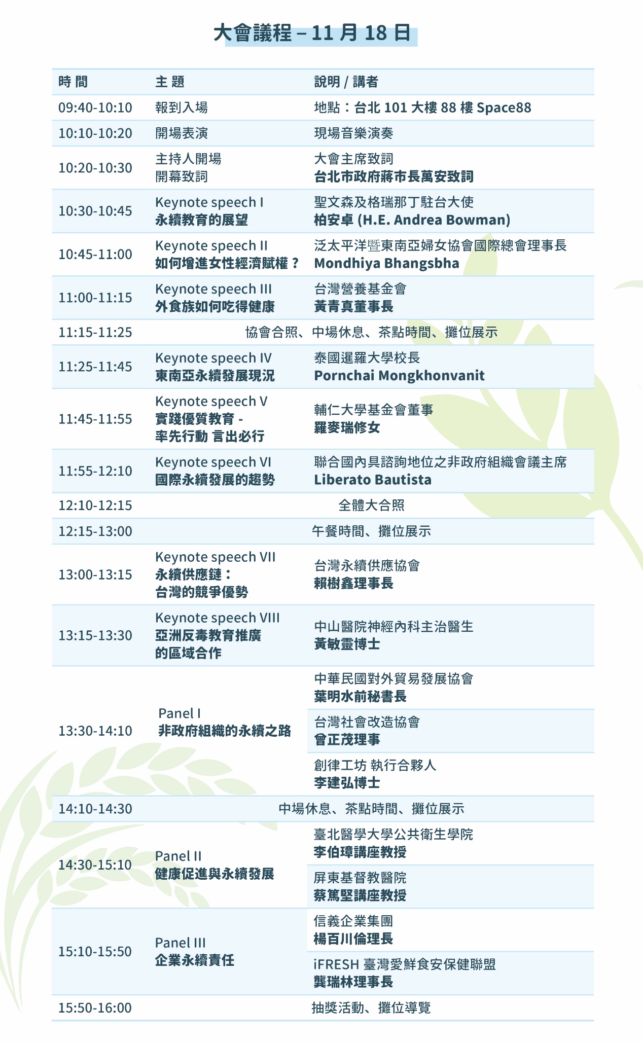 本次論壇的重量級嘉賓包括聯合國國際 NGO 組織 CoNGO 主席代表、聖文森駐台大使、PPASEAWA 國際組織代表、國際扶輪第 3481