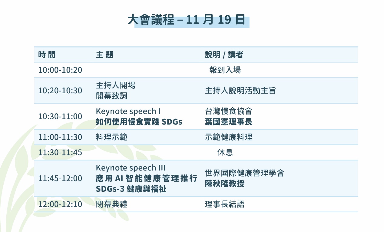 台灣愛鮮食安保健聯盟、台灣慢食協會、屏東基督教醫院、台北醫學院附設醫院、台北醫學大學教授和台北輔仁大學教授等國內知名機構和專家一起共襄盛舉,讓與會者獲取最新的永續產業資訊,響應國際實踐SGDs