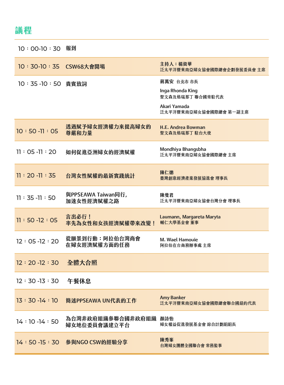 CSW68)週邊平行會議」,訂於中華民國113年3月14日假臺大醫院國際會議中心301廳舉辦線上及實體會議,並邀請臺灣、日本、泰國、聖文森及格瑞那丁、美國、德國及阿拉伯講者,共同研討亞洲各國的不同行動。
