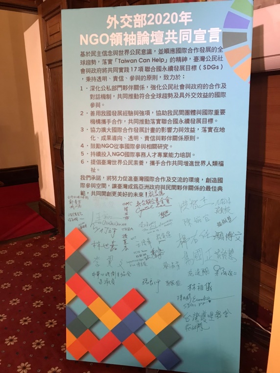 外交部為慶祝「非政府組織國際事務會」成立20週年,於本(109)年10月中旬分別舉辦援外成果展、NGOs領袖論壇及週年茶會等系列活動。